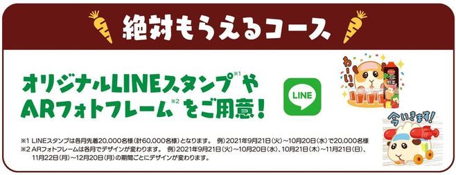 “絶対もらえるコース”のARフォトフレームは9月21日~10月20日、10月21日~11月21日、11月22日~12月20日と、月ごとにデザインを変更する。LINEスタンプは月ごとの各期間に先着2万人、計6万人にプレゼントする。