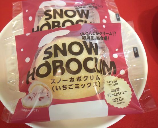 今回発売する「スノーホボクリム(いちごミックス)ほぼほぼクリームのシュー」は、「ホボクリム ほぼほぼクリームのシュー」を冬季に合わせてアレンジしたもの。ふんわりもちもちした超薄皮のシュー生地に、イチゴの果肉がゴロゴロとはいったホイップクリームとミルククリームをぎっしりと詰め込んでいる。税込245円、2020年1月27日までの期間限定。