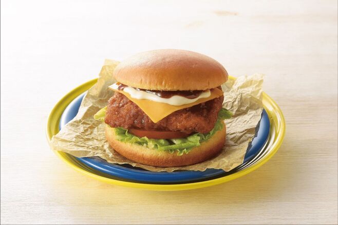 「ゆるキャン△ フィッシュバーガー」(税込397円)は、2種類のチーズ、トマトとレタス、白身フライをサンドしたボリュームのあるフィッシュバーガー。