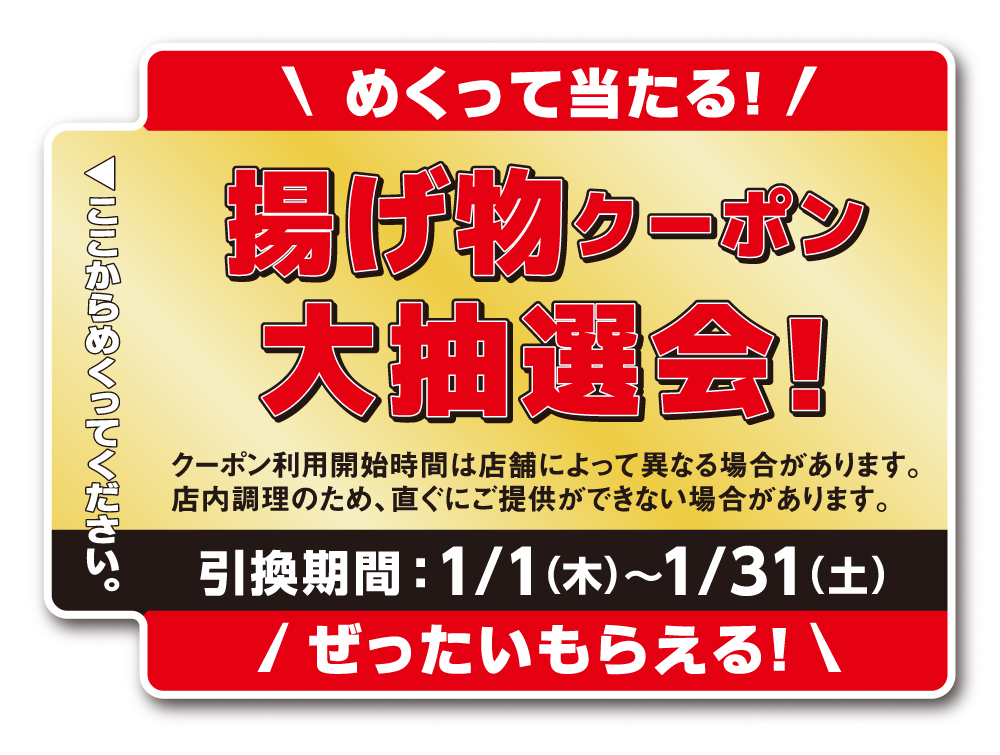 また、購入者は、1等(200円引き)、2等(100円引き)、3等(50円引き)のいずれかが必ず当たる「値引きクーポンくじ」がプレゼントされるという。クーポンくじは、2026年1月1日(木)~1月31日(土)の期間、対象商品の揚げ物に利用できる。