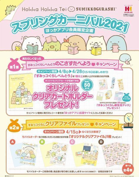 第2弾「すみっコぐらしクリアファイルプレゼントキャンペーン」は4月15日から開催。“ほっかアプリ”から使用できる事前注文サービス「モバイルオーダー」を利用した人を対象に、すみっコぐらし「クリアファイル」1枚をプレゼントする。キャンペーンは全商品が対象。クリアファイルは全4種類あり、好きなものを選べる。なくなり次第終了。
