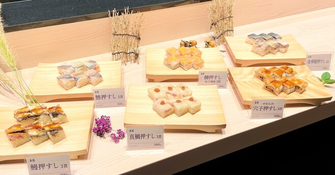 今回のリニューアルではサイズを小さくし、好きな押すしを1貫から選べるようにした。価格は1貫100円。ラインアップは、定番の「バッテラ」「鰻押すし」のほか、「真鯛押すし」「鯵押すし」「金華鯖押すし」「やわらか穴子押すし」などで、季節ごとに一部商品の入れ替えを行う。マダイやアジは、軽く酢にくぐらせるだけなど、生に近い素材も取りそろえているのが特徴だという。