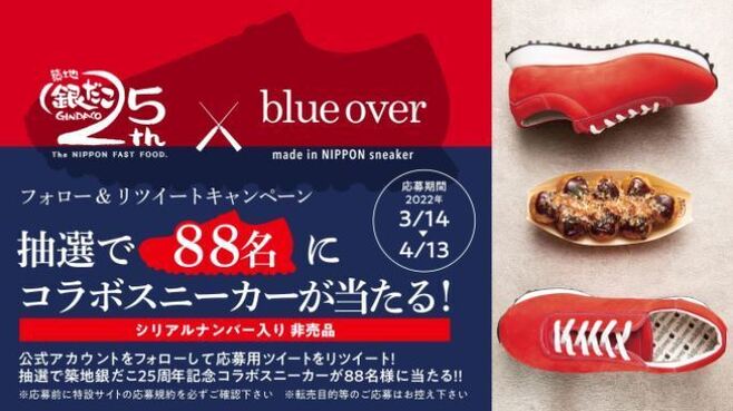 築地銀だこ25周年を記念する特別企画。完全受注生産による予約販売をブルーオーバーのオンラインサイトで行うとともに、Twitterの築地銀だこ公式アカウントで、シリアルナンバー入りの非売品をプレゼントするフォロー&リツイートキャンペーンを展開する。