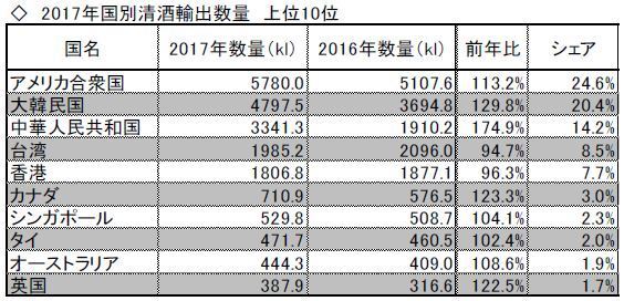 国別の輸出数量ランキングでは米国が昨年に引き続きトップでその数量は5,780kl。実に全体の4分の1近い数量が米国へと輸出されている。中国は74.9%増で上位10位の中では群を抜いた伸び率。反対に台湾は5.3%減、香港は3.6%減となった。韓国は29.8%増と順調に伸長している。