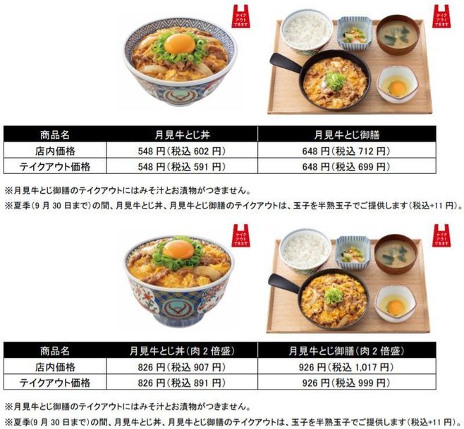 吉野家「月見牛とじ丼」「月見牛とじ御膳」価格表とメニュー画像