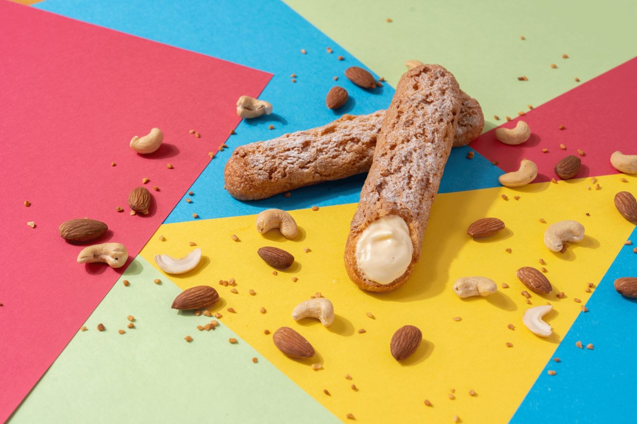 片手で持ちやすいスティック型のシュー生地に、カシューナッツやアーモンドを使用したクロッカン生地を乗せて焼き上げた、香ばしいザクザク食感が特徴のシュークリーム。